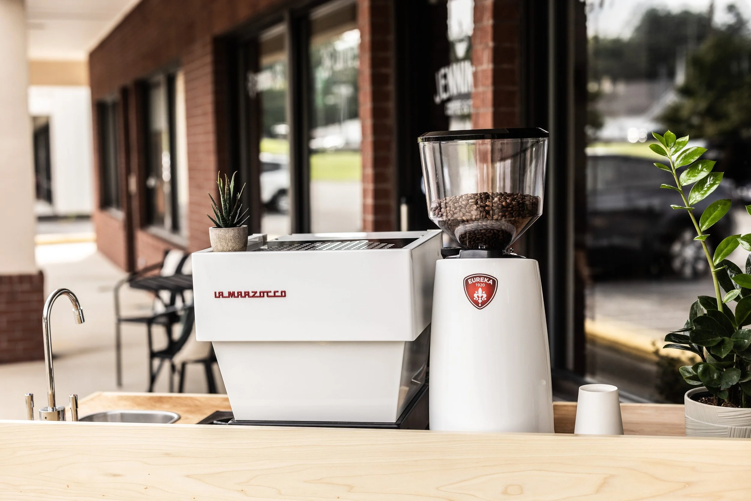 Coffee grinder, La Marzocco espresso machine, small potted plant, green leafy plant, white cup, and wooden countertop at an outdoor café.
