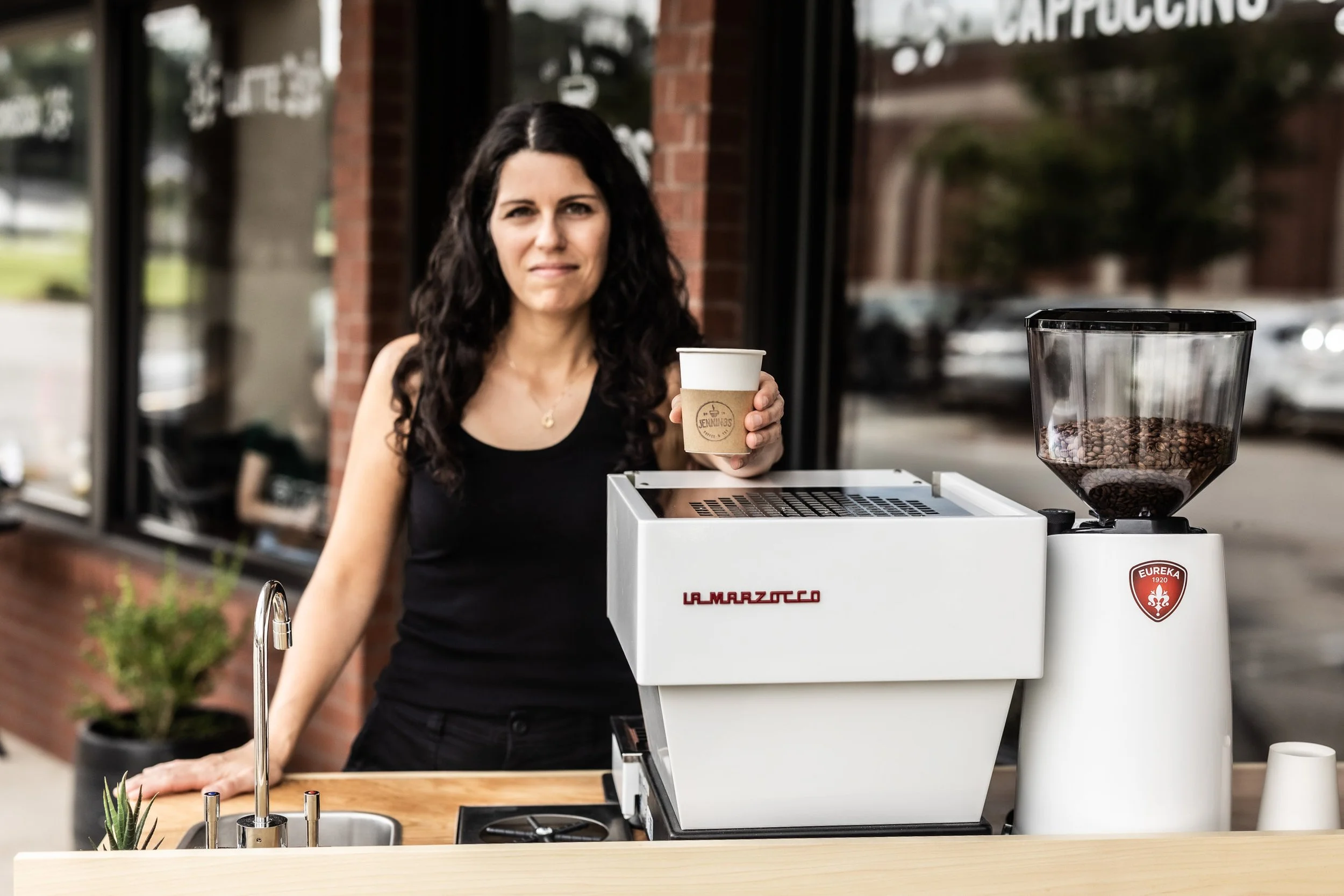A woman with dark hair and a black tank top is handing a coffee cup to the camera outside a cafe. The coffee cup has latte art on top and a label that says 'Jennings.' There is a coffee machine with a plant in a pot on it, a sink, and a wooden counte